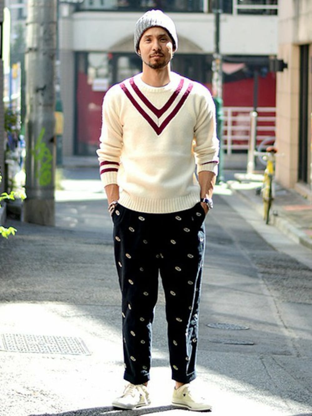 クルーネックのチルデンニットにエンブロイダリーパンツで「プレッピー」を意識し、 パンツのシルエットで遊びを効かせました。 パンツのインパクトがあるのでその他のアイテムは控えめに・・・