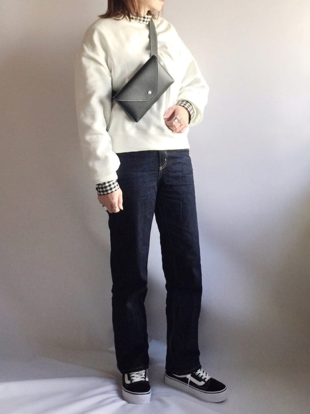 白×黒×デニム 丈の短いトップスににハイウエストのボトムス👖 のバランスが好きだけども、 イマイチその良さが伝わらない写真🙈💧 なんだかんだ1番出番の多いVANSオースク、 密かに厚底デビュー😋←密か感ゼロ シンプルなコーデなので、バッグやギンガムで 今っぽさをプラス😚❣️