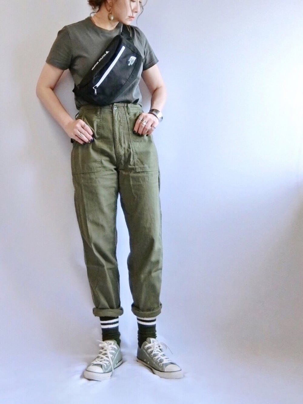 ほぼ、カーキづくし💚 黒っぽく撮れちゃったけど、靴下もカーキ。 UniqloUのTシャツは去年買ったやつ。 今年はカラーたくさん揃ってたけど、 カーキ見かけなかったような? 気のせいかな?🤔