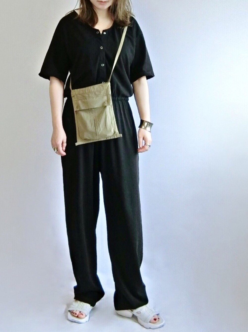 ブラック×カーキ×ライトグレー スナップボタンにトキメいたオールインワン💓 ストレッチの効いた生地でストレスフリー。 ポンプサンダルの爪先のぞき具合がすっかりお気に入り🥰