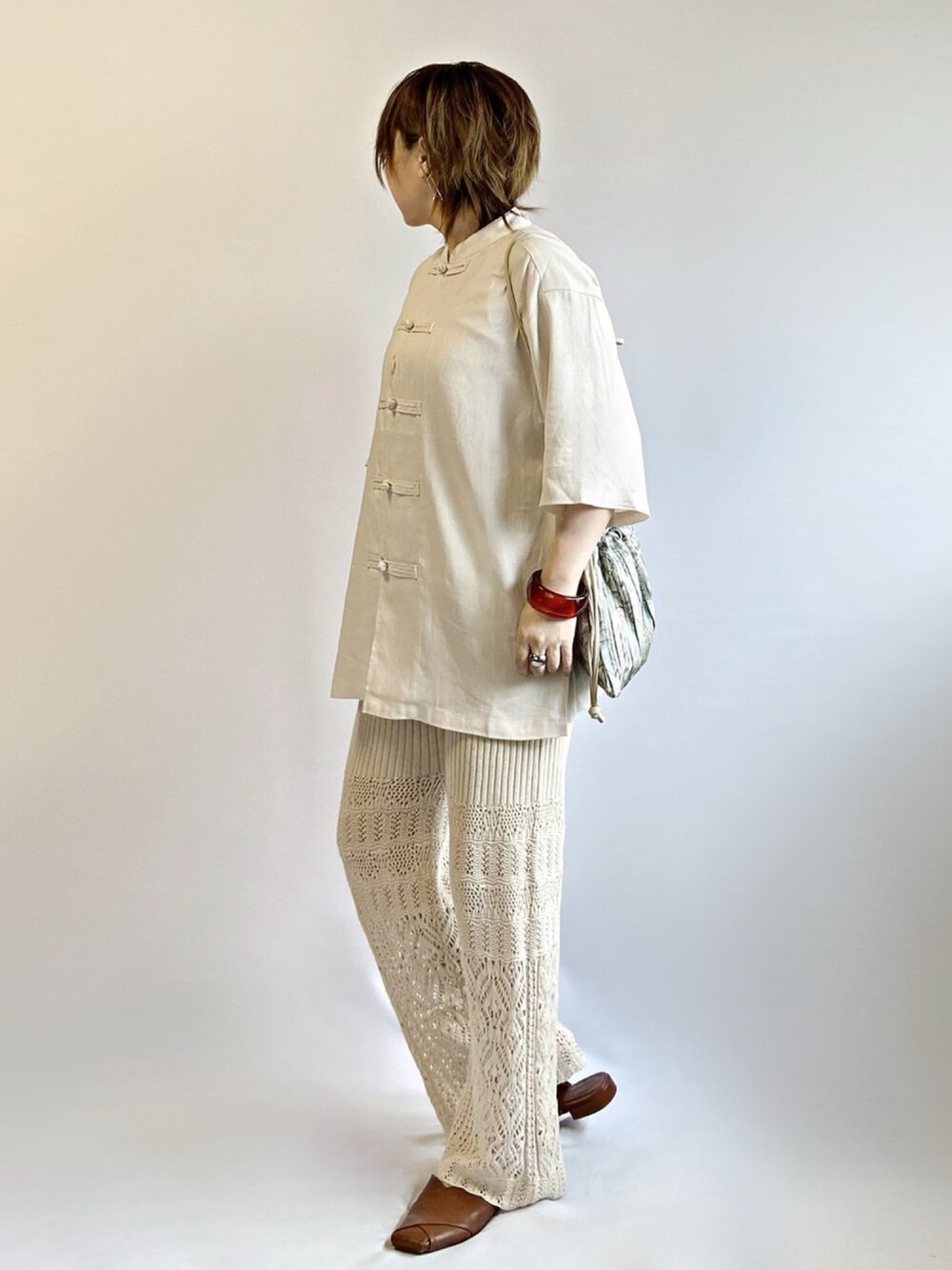 お気に入りチャイナシャツ😊 プチプラとは思えぬクオリティの高さ✨ 前開けて羽織ってもいい感じ👍🏻 透かし網みのパンツ、こんなに涼しいとは思わなかった😳 スースー風が通るので、穿いてるか不安になって 下見ちゃうくらい😂 脚を隠しつつ涼しいなんて、これからの季節助かる🎵