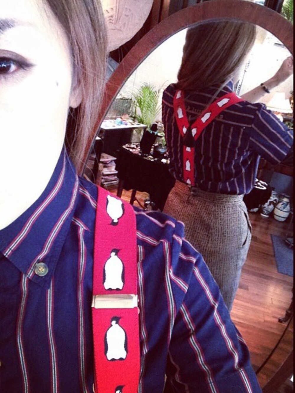 サスペンダーに光を合わせたら顔真っ白。とほほ。。。ペンペンペンなサスペンダー。