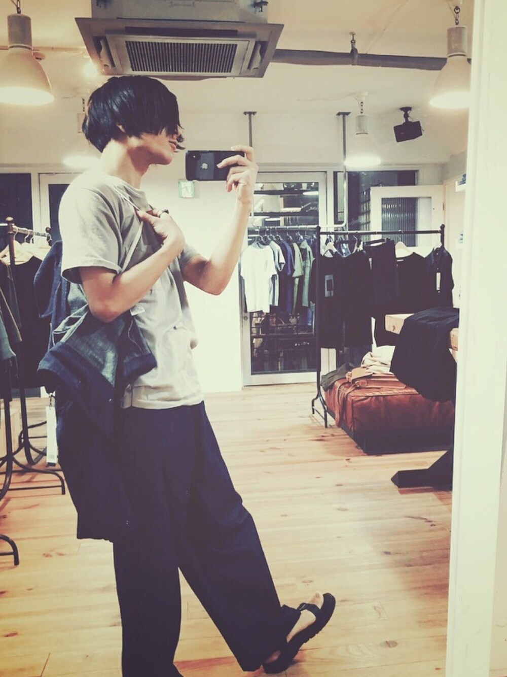 KURO原宿店に行って来ました、トータルコーディネート完成しました、セットアップ風 このジャケット、内側に紐がついてて、暑い時こんな感じで背負えるんですよ、面白いでしょ?