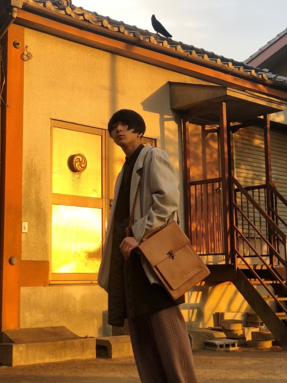 上にいるカラスが気になりますが… 殆ど古着です、鞄はオリジナル 作ったのは僕じゃないけど 分かりづらいけど軍モノのライナーをジャケットの中に着てレイヤード感出したつもりです、無駄にでかいパンツとの相性が良さそうな丈の長いものがマストなのかなと