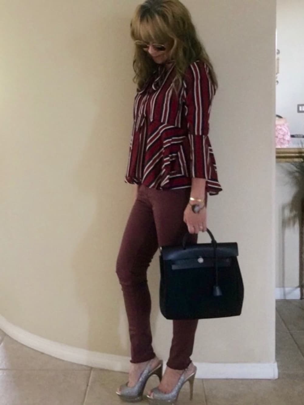 イタリアンカラーでストライプを探したら 見つけたベルスリーブのブラウス☆リボン ネックになっているけど敢えてダラダラで 結ばないのもアリかも♩