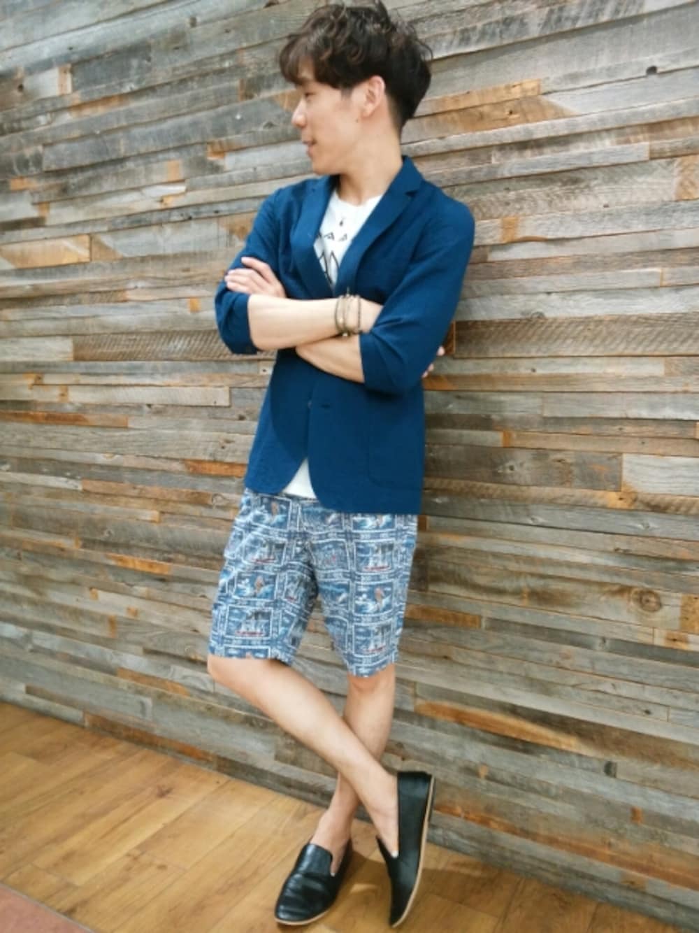 本日のスナップ。 サマージャケットいいですねぇ♪ ワンパターンになりがちなホワイト×ネイビーコーデも柄もの1点投入でちょっと変化するかも? てか、髪切りました。