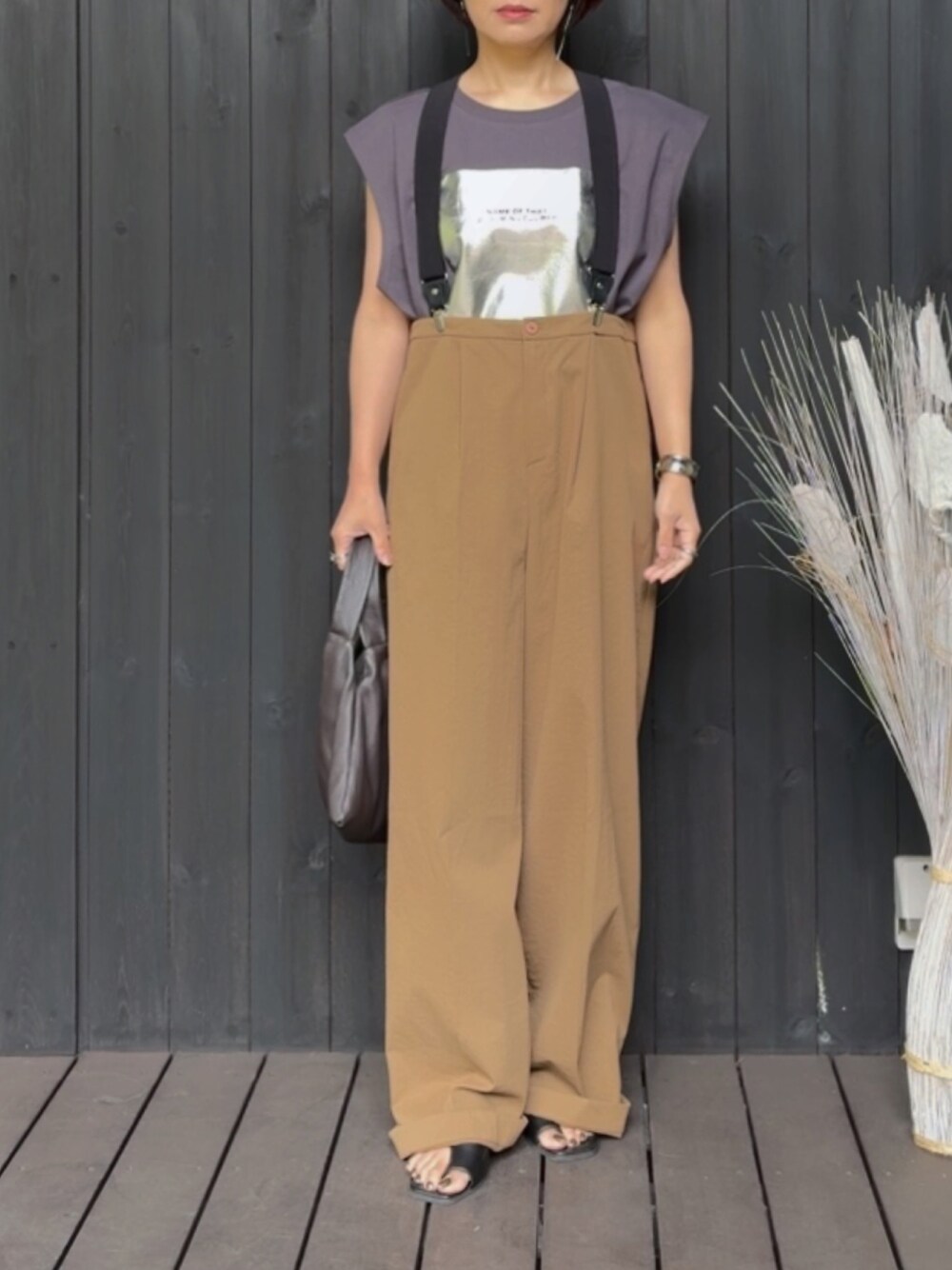 ご覧いただきありがとうございます😊 サロペットコーデ♡ select MOCA ▶︎箔プリントノースリーブTシャツ Sサイズ 肩のラインがすっきり見えるシルエットで大人でも着やすいノースリーブ✨ 大人カジュアルに映えるビンテージ風の箔プリントがアクセントに💕ジャケットやシャツのインナーにも大活躍◎ Sサイズはコンパクトな丈感でバランスも取りやすく低身長さんにおすすめです👌 ▶︎フェイクレザートングサンダル AGAWD ▶︎サスペンダーパンツ ANOH ▶︎バングル LHME ▶︎プランクリング MANOF ▶︎ITTI✖️MANOF TOTO BAG instagram→ nagu_beni1125