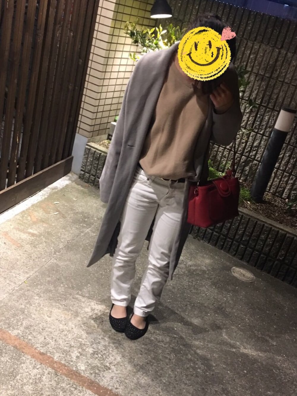 服はシンプルにして、赤のバッグでアクセントをつけました!