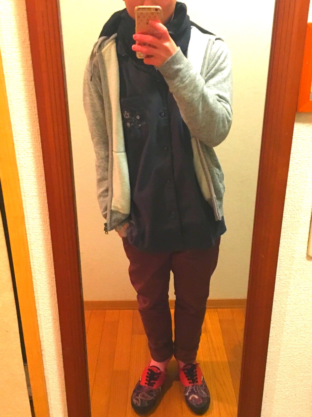 去年の冬の写真なんですけど笑、 Niko and…で一目惚れした花柄のシャツに上はグレーのパーカーで色を分けて、下は赤でハッキリと見せました。 この赤の靴のペーズリーがすんごく気に入ってるんです!笑