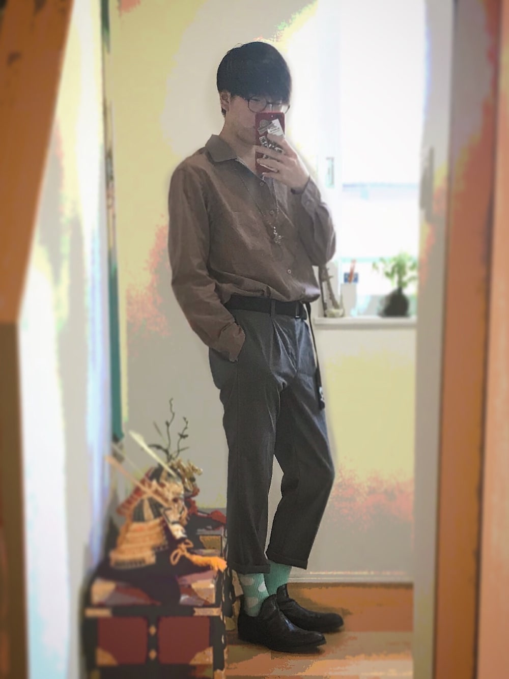 今日は地味な色合いのシャツとパンツで靴下を目立たせるコーデです😆 片方だけドット柄っていう変わった靴下に一目惚れしました😍 暖かかったり寒かったり、体調を崩しやすい気候ですが、体調管理はしっかりしましょう😊 もしよければいいね、フォロー、SAVEお願いします🤲 フォロバ100%です🌞
