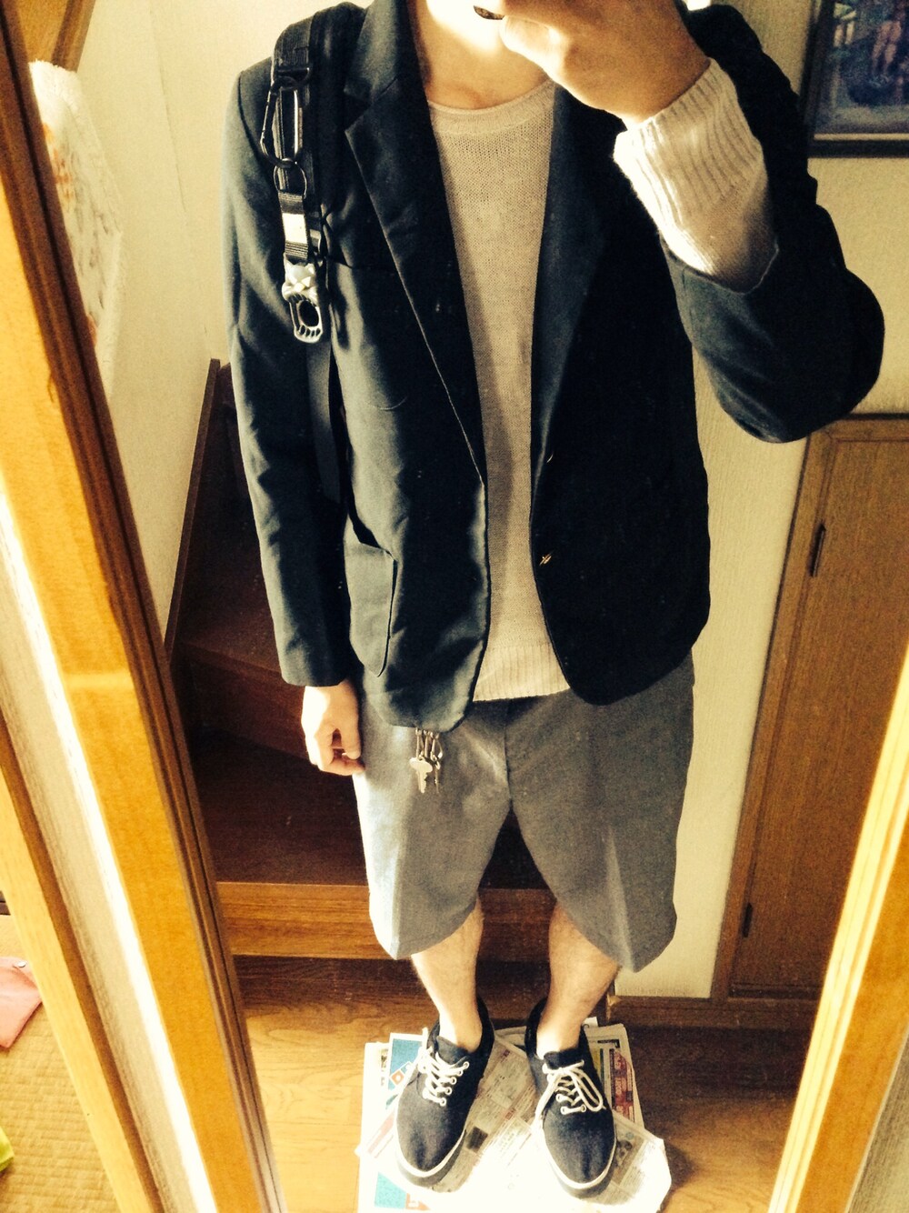 ジャケット:古着 ニット:無印良品 パンツ:古着 シューズ:coen この靴本当に動きやすくて便利です
