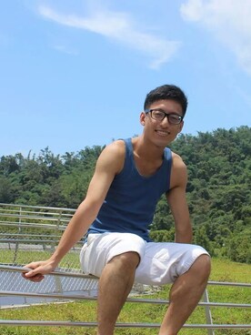 「藍色背心(タンクトップ、ブルー系)」を使った、Benny Wongさん(メンズ・160cm)の夏コーディネート
