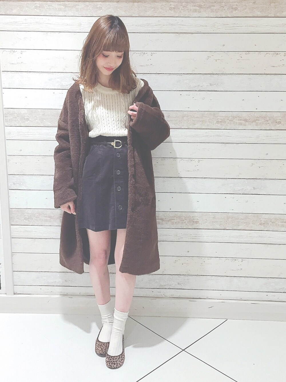もこもこあうたーはbrownでちょっぴり大人っぽい合わせに❣️ ・ 丈短スカートにはロングコートの合わせがgoo💕