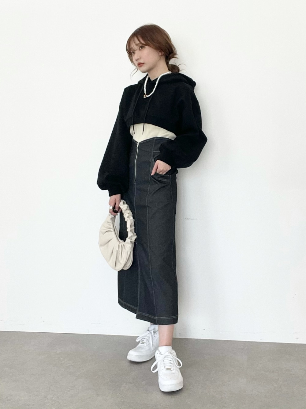 black style! クロップド丈のトップスが今年っぽくて◎ ハイウエストのボトム合わせでスタイルアップして見えます✊🏻 オールブラックでモードな印象に🗝