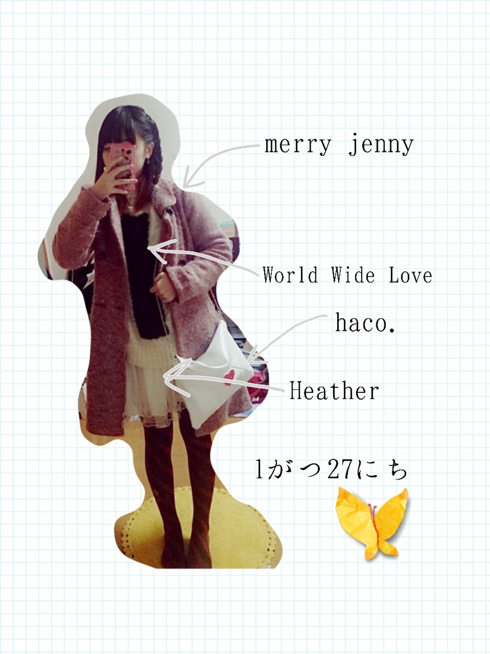 ホワイト×柄タイツ(・8・) 黒いクロスがあるから真っ白しろすけでは無いけれども(笑) 斜めの柄タイツは脚が太く見えないのでオススメ◎ 今日は親友とアウトレットいってきまーす♡