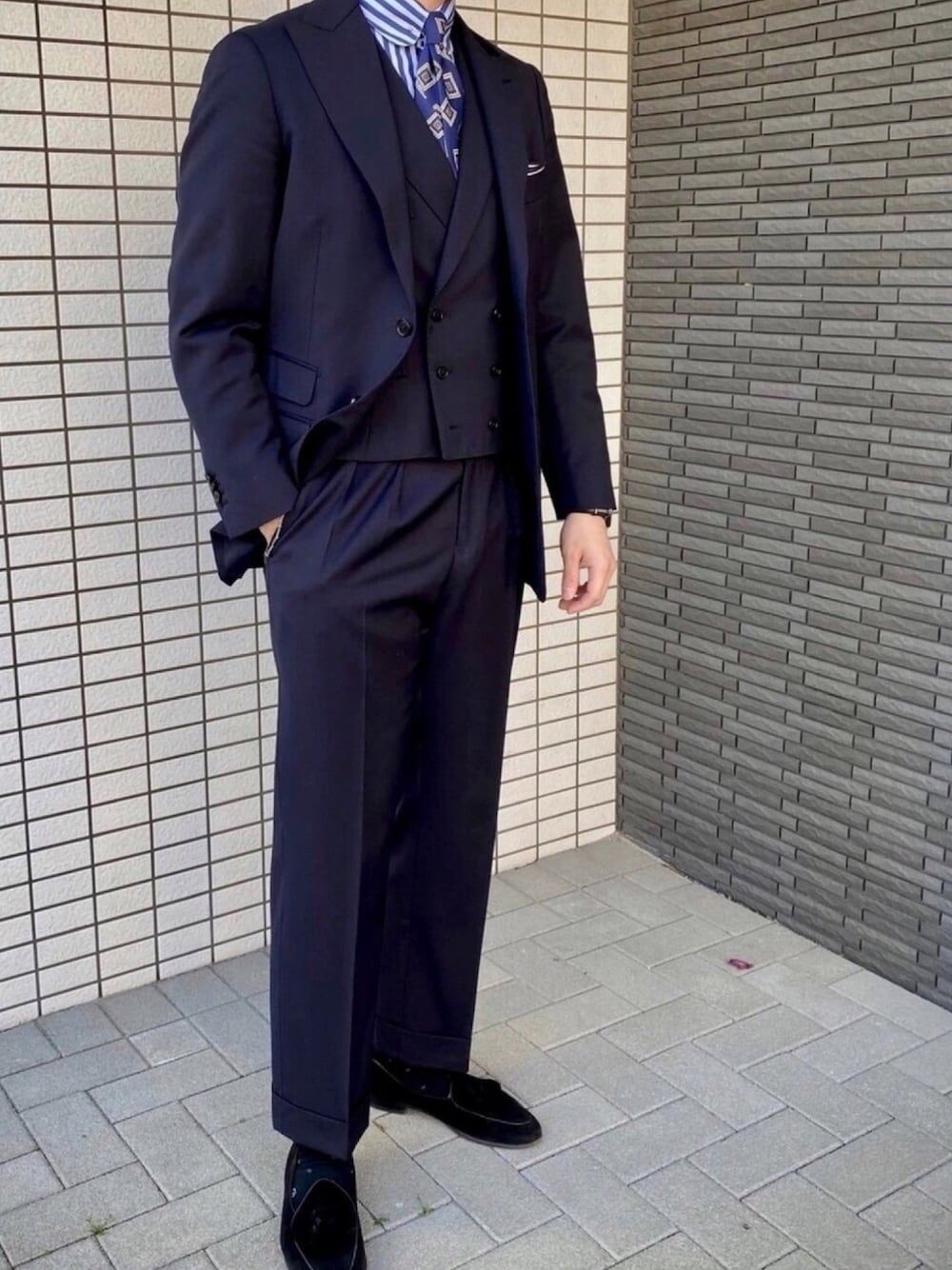 久々のタイドアップ。生地はTollegno。 ラウンドピンホールカラー パンツは2インタック 太めでストレートに近いシルエットです。クラシックなイメージ