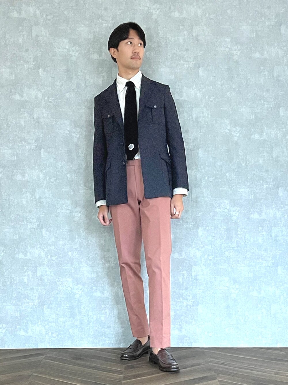 ノーフォークブレザーに、ぱっと目を惹くカラードパンツをあわせた遊び心あるプレッピースタイル。 シャツはグレージュを合わせて、コーディネートを柔らかい印象に。 足元はローファーで合わせて、BERKLEYらしい合わせにしました! 身長:181cm ブレザー:82106160/ネイビー/M シャツ:82766713/グレージュ/M パンツ:82265860/ピンク/78cm ネクタイ:82906003/ブラック/F