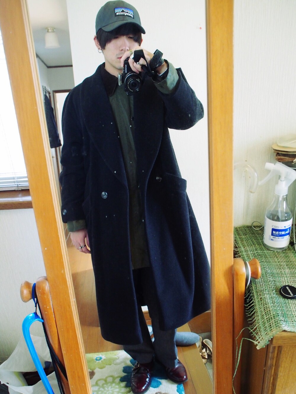 Patagoniaキャップ×barbour vintage gamefair×カシミア混コート×シャンブレースラックス×アルフレッドサージェント barbourをインナーに。。 アウター×アウターで今期1番の寒波を乗り越えます。。