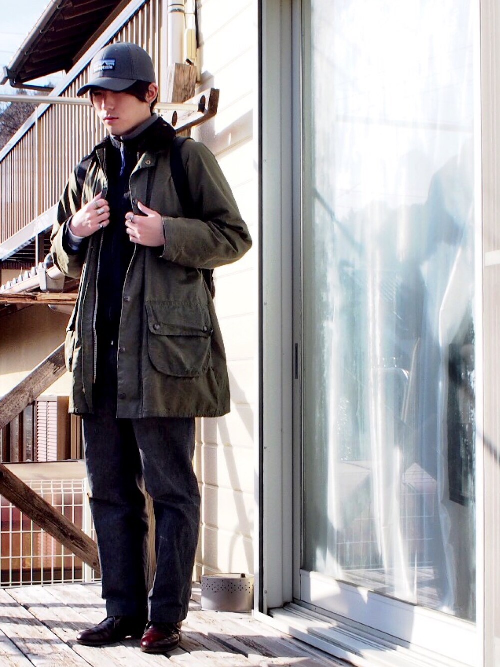 インナーにPatagoniaのフリース、アウターにbarbourです。グレーで統一感を。 今日は暖かいですね。