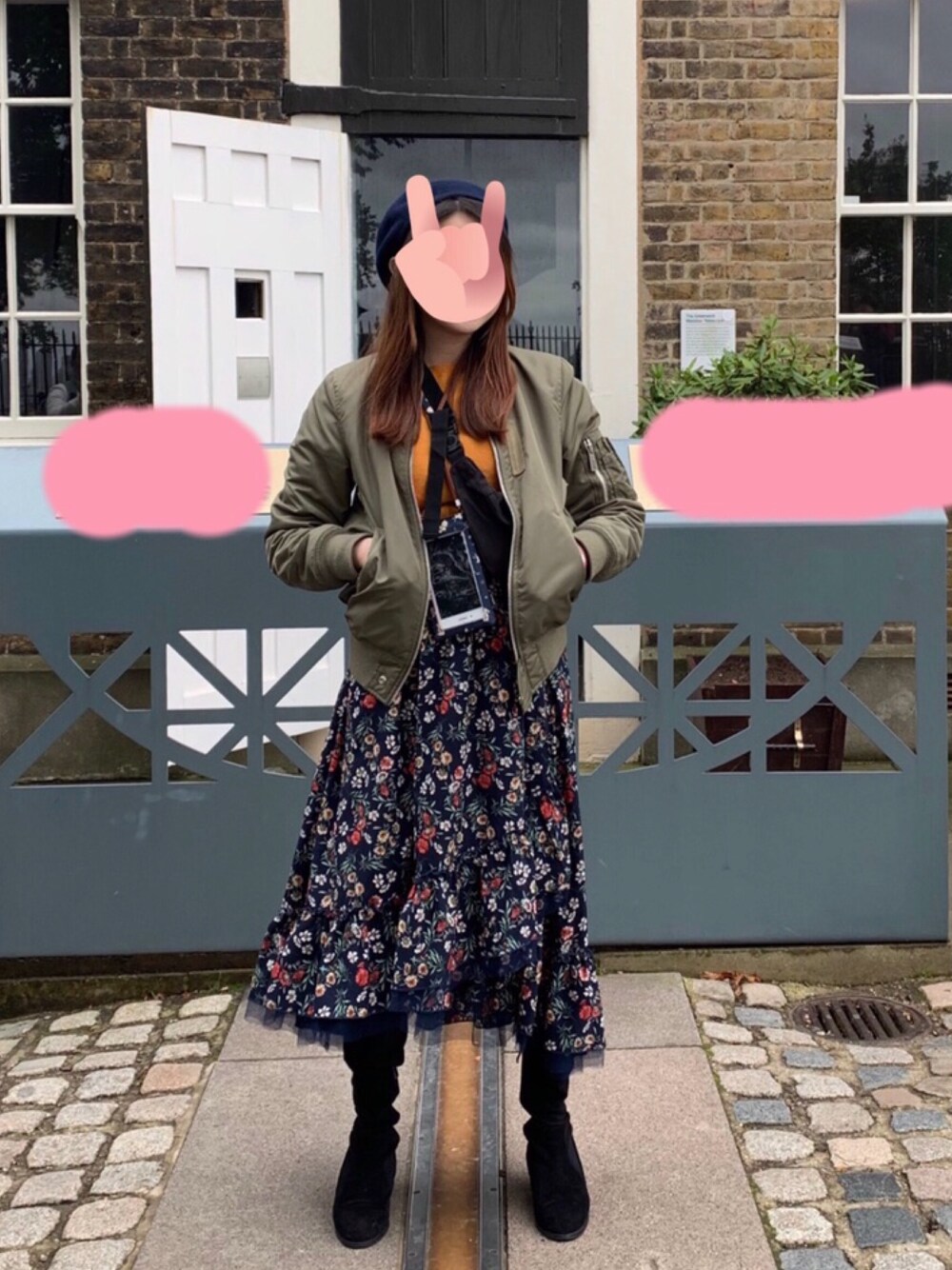ブルー系のハンチング/ベレー帽を着用したレディースの秋コーディネートの1枚目の写真