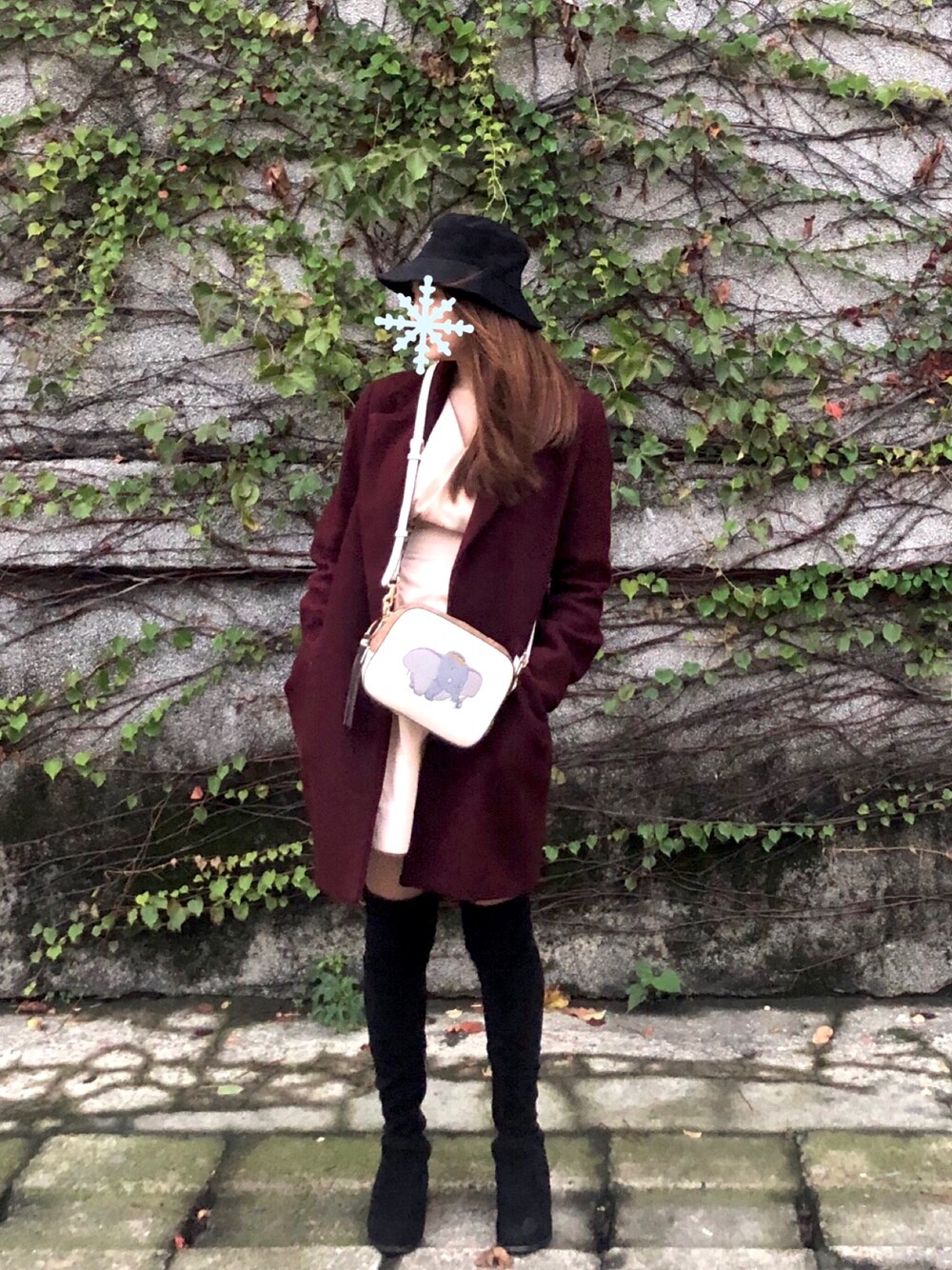 ベージュ系のショルダーバッグを着用したレディースの冬コーディネートの1枚目の写真