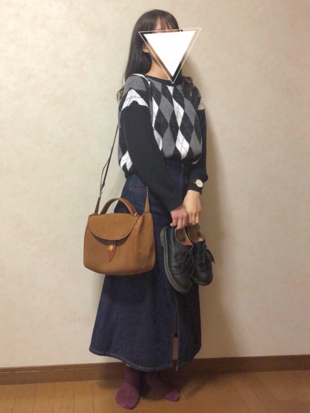GUコーデ😇💫 柄物のトップスはあまり持っていませんが、色味が落ち着いてるので派手な印象にならないのが気に入ってます🐼 逆に色味が無さすぎるのがつまらないので、靴下で差し色🍷