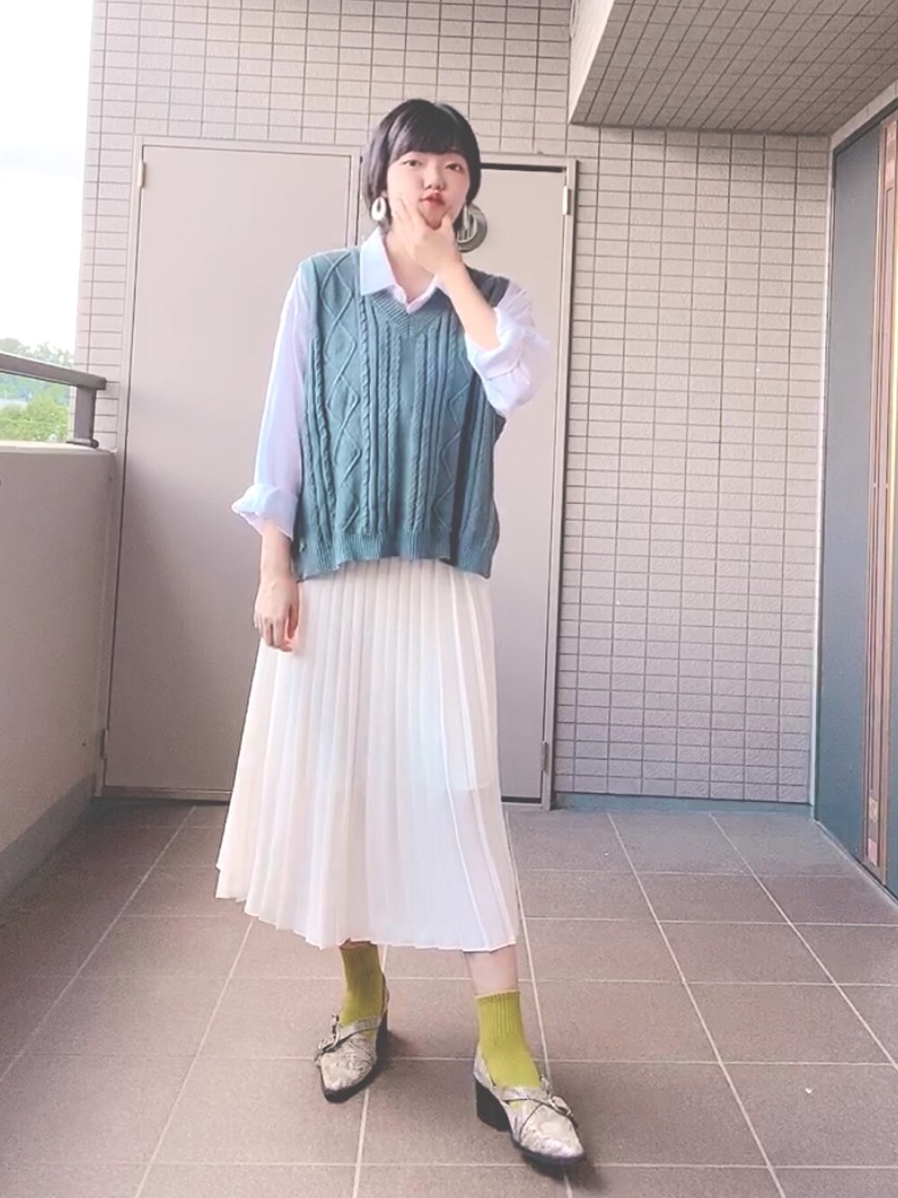 最近ユニクロでプリーツスカートを買ったので使ってみました!! 今回は秋でも使えるニットと合わせて爽やかに着ております! 涼しい夏のニットコーデ🧶