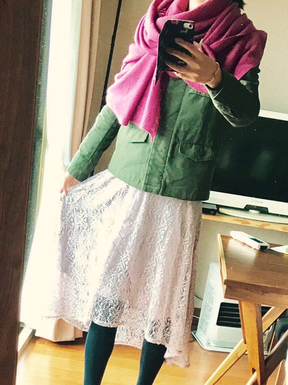 アリアンナのストールがポイント♩ 巻き方にもこだわって、きれいなドレープ作り。ピンク+ミリタリーで等身大。 休日気分がアガるコーデ♩
