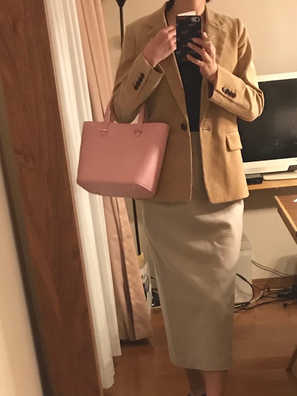 白のタイトスカートはオススメ!女っぽさとスースーしないあたたかな着心地が良いの^ ^ベージュジャケはきれいめにも、かっこいいめにも使いやすい☆