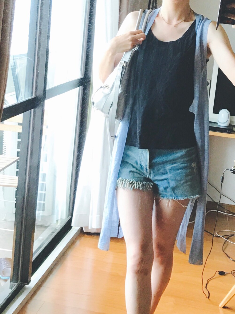 カジュアルなのにきれいめなショーパンコーデ。ジレがノースリなので、インナーもノースリにするとすごくすっきりまとまる。Iラインで細見え。あえてバッグは本革で高級感を出した。上級グラデコーデで記憶に残るはず!(^^)