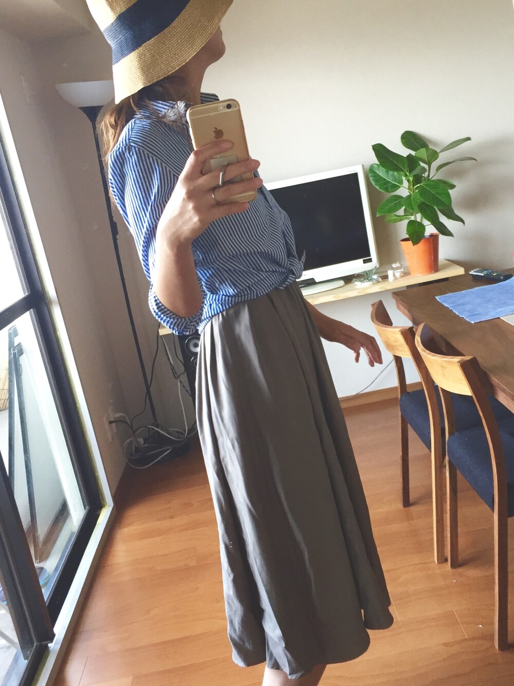 お気に入りワンピをスカート風に。水色シャツは襟の花がポイント。帽子も夏気分で日差し対策もok!