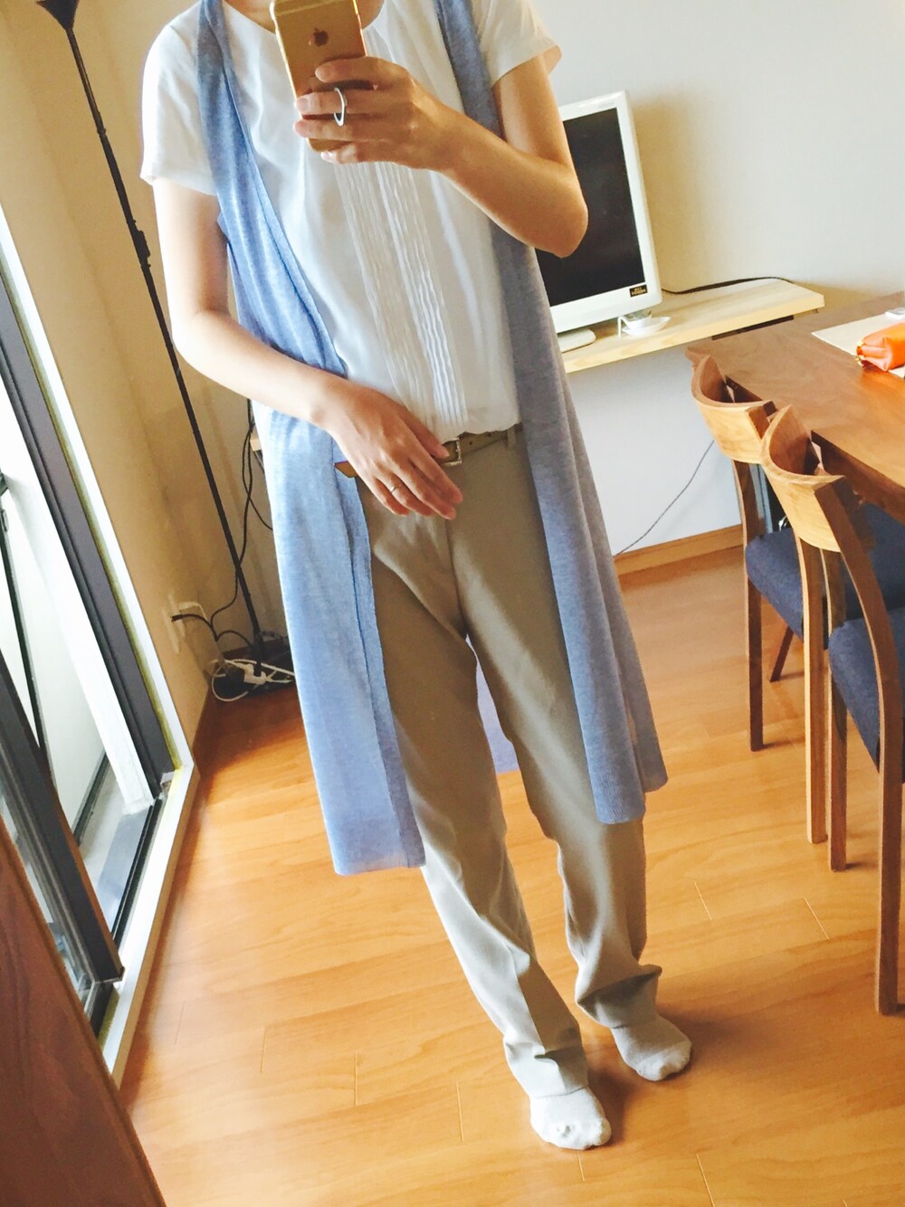 水色ジレで涼し見え。最近はトップス半袖なら下はあまり露出しないほうが、おしゃれに見える気がする♪