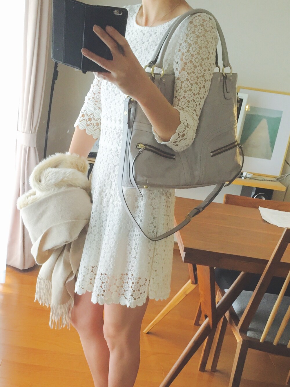 あまからみっくす☆レースワンピ着ると春気分!でも白は目立つから少し下を向いてしまうから、いつものレザーバッグで安心感も持っていく♪ストールも優しい色で気持ちも柔らかく☆