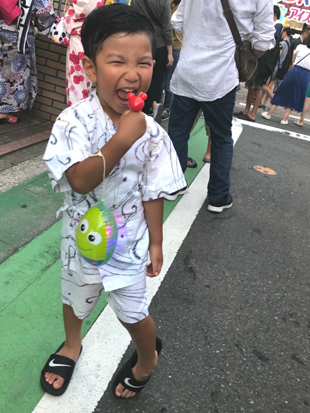 近所の夜市へ 子供は寿命短いヒカリモノ好きだよね 甚平はAEONで安く買えた^ ^