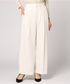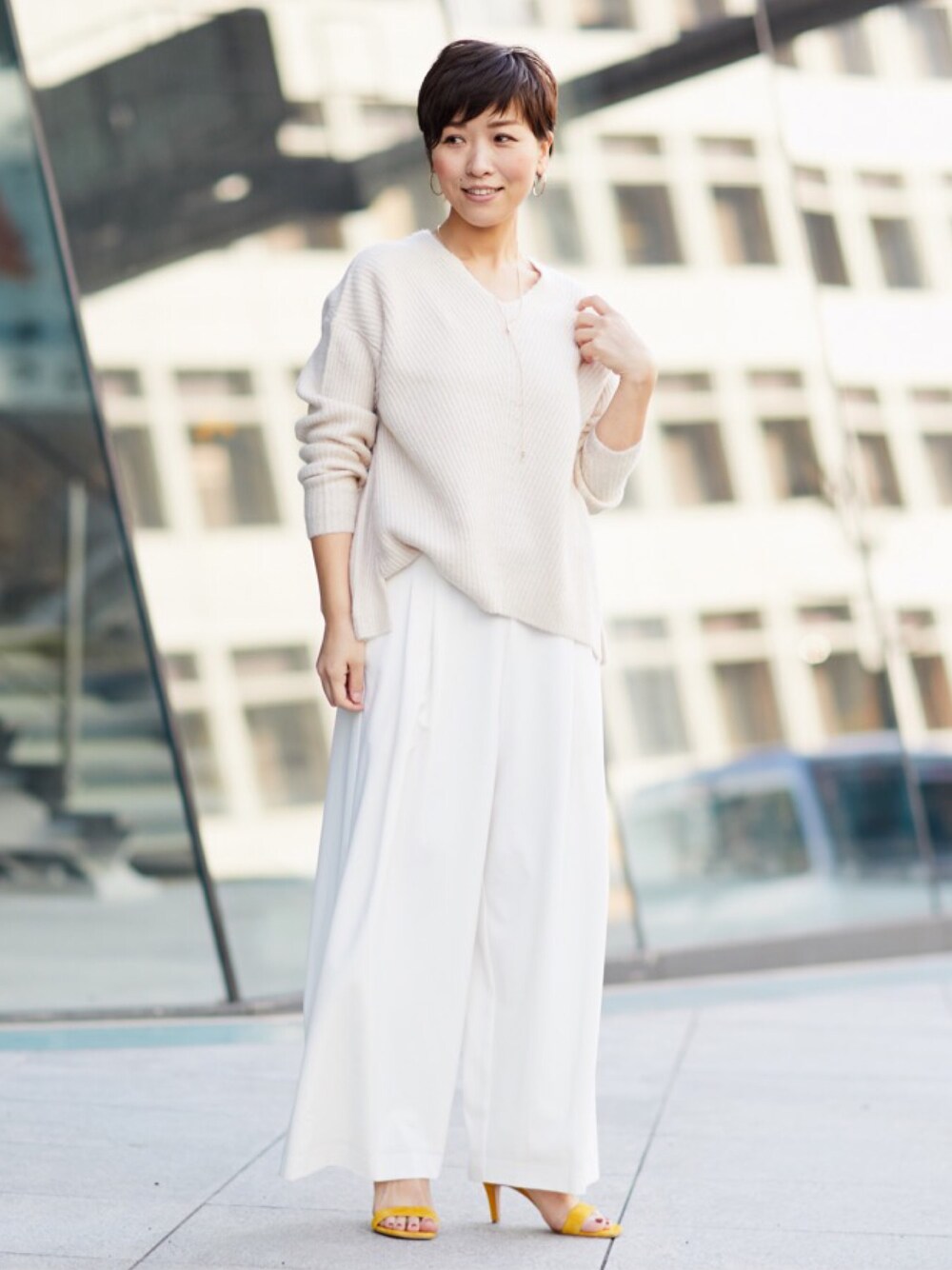 ピンクベージュのニットにクリーンな白ワイドパンツのシンプルコーディネート。明るいトーンで華やぎ感ある印象に。