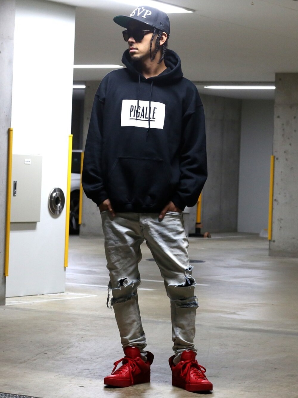 BLACKSCALEのVSVPキャップ PIGALLEのパーカー H&Mのパンツ LOUISVUITTONのスニーカー