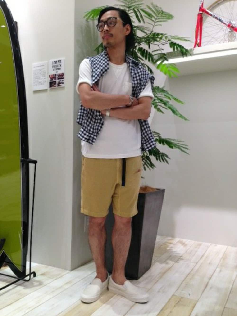 ニュアンスカラーのショートパンツ×ホワイトアイテムのコーディネートに、ギンガムチェックシャツをポイント使い。