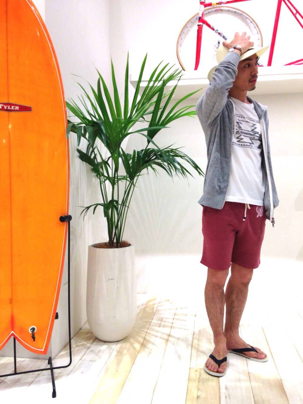 初夏を感じさせるスタイリングに仕上げました。ハットとパーカーをベースにラフさのでるスウェットショーツをチョイス。今季のトレンド柄ネイティブ柄はTーSHIRTで。