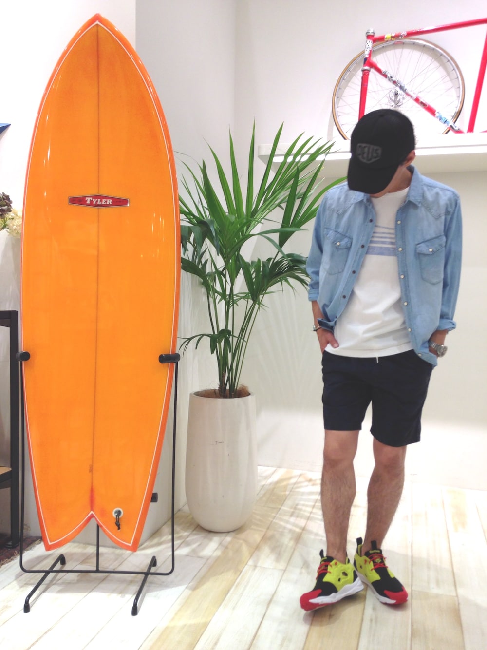 今季トレンド柄ネイティヴ柄でのスタイリング。主張しすぎないショーツは柄アイテムとも相性は抜群。デニムSHはオールマイティに活躍!