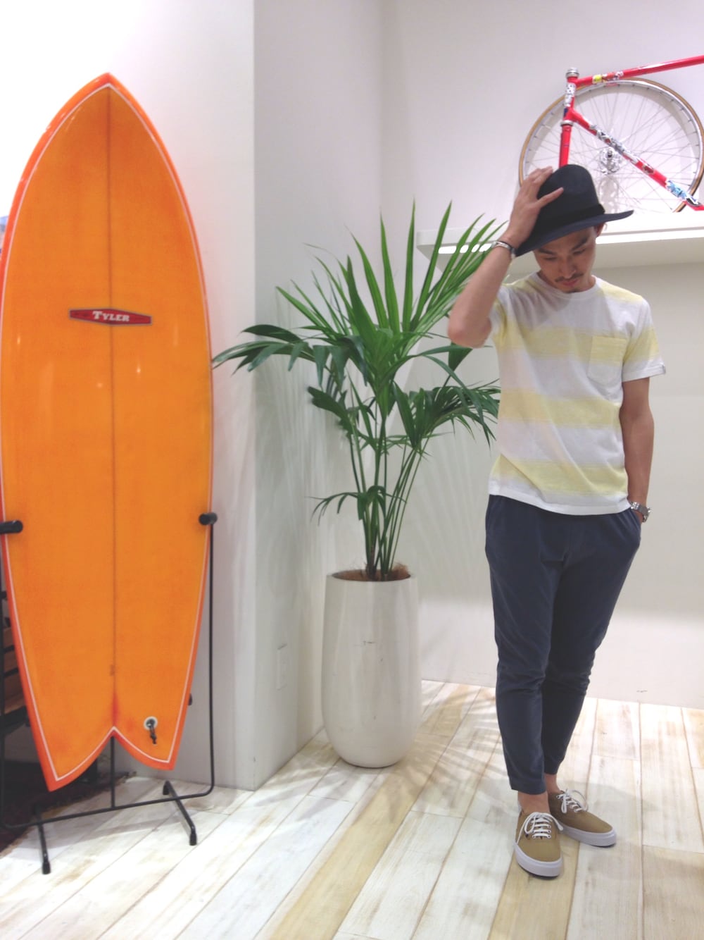 夏らしい黄色ボーダーをチョイスしてのスタイリング。パンツはラフに着こなせる様にカット地のパンツをチョイス。 ラフさの中に大人の遊びを入れてみました。