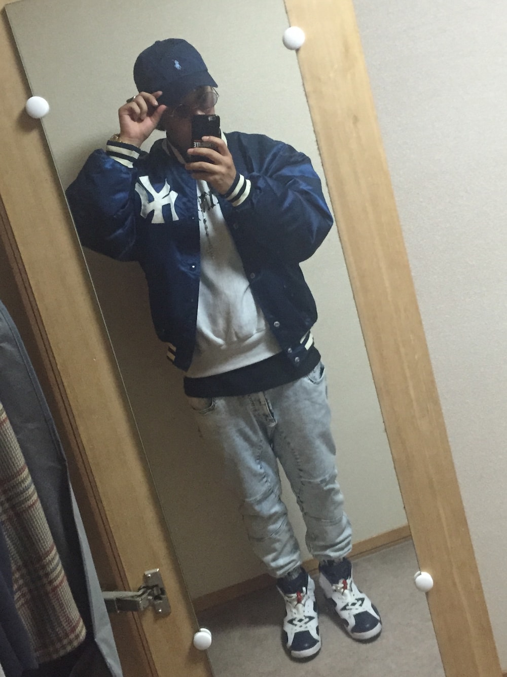 全体をネイビーで統一して、今流行りのジョガーパンツで更にスニーカーの格好良さを引き立ててます!