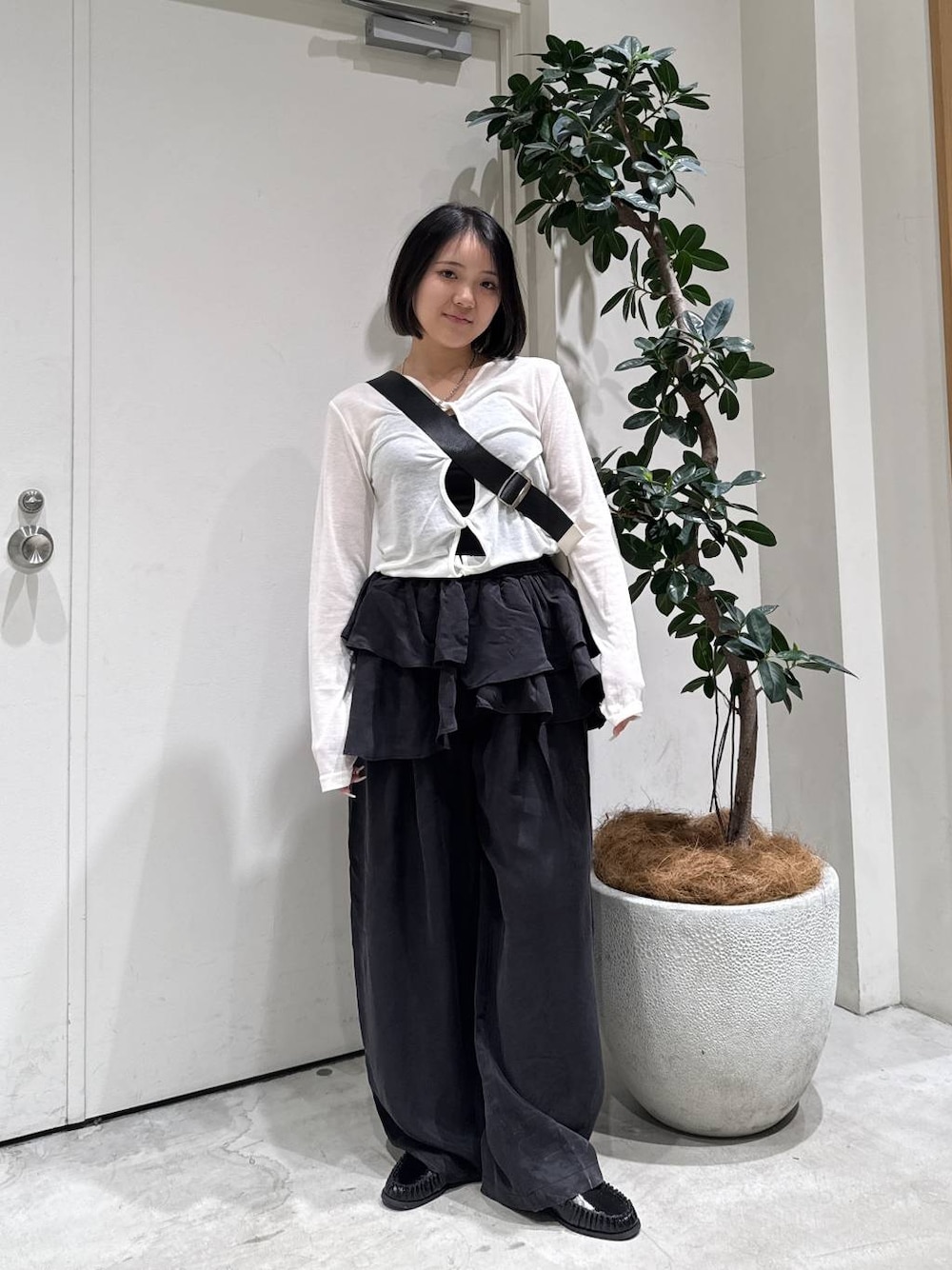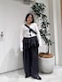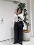 シアーリブ2wayプルオーバー🤍 前後2wayで着れるおすすめトップス かなり薄め素材ですが中にインナー着ていただけるサイズ感になるのでレイヤードも楽しめてトレンド感のあるスタイリングができます! EF フリルパンツ🖤 特徴的な素材感とデザインでシンプルなトップスもこのパンツを合わせるだけでモードはテイストでオシャレに着ていただけます! 丈感はやや長めなので低身長さんは底の厚いシューズを合わせてスタイリングしていただくと綺麗にまとまりやすいです!