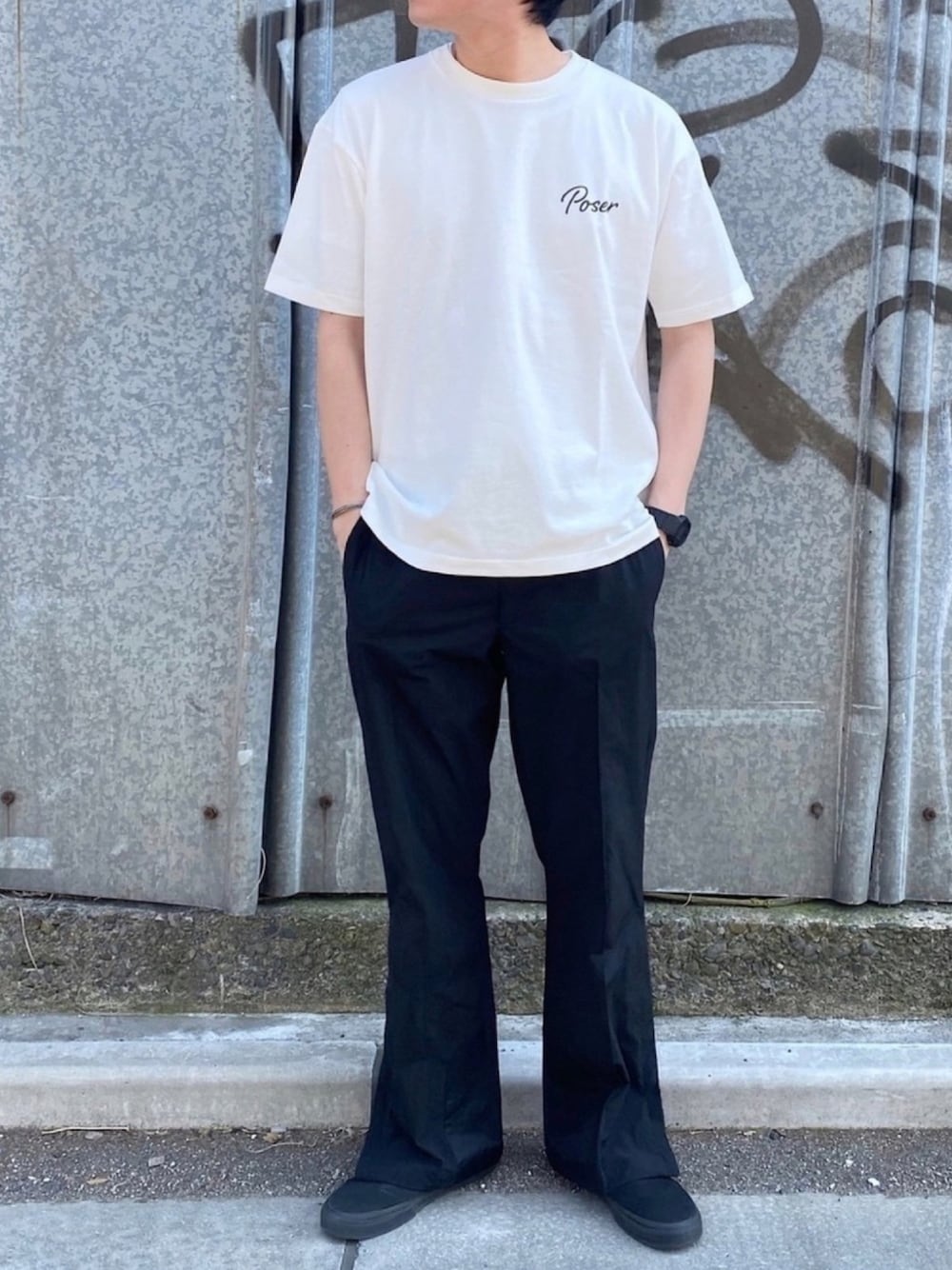 BAYFLOWのインブランドPOSERのTシャツにフレアパンツとスリッポンで合わせたストリートスタイル。Tシャツに合わせてモノトーンでまとめてみました。