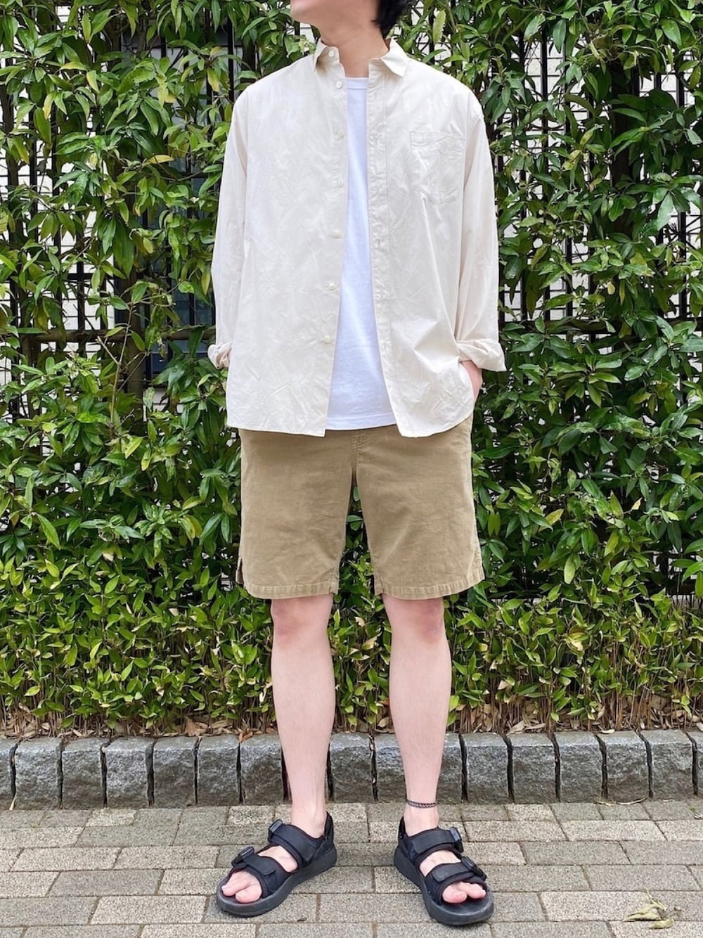 BAYFLOWのサマーコールショーツに無地シャツを合わせたワントーンコーデ。