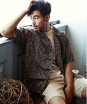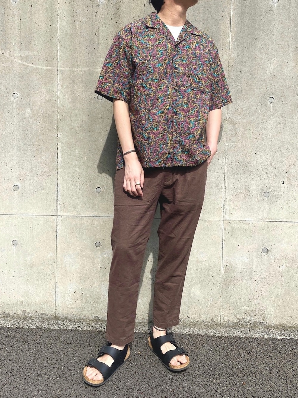 ワイドシルエットのアロハシャツに同色系のリネンパンツを合わせたブラウンのワントーンコーデ。