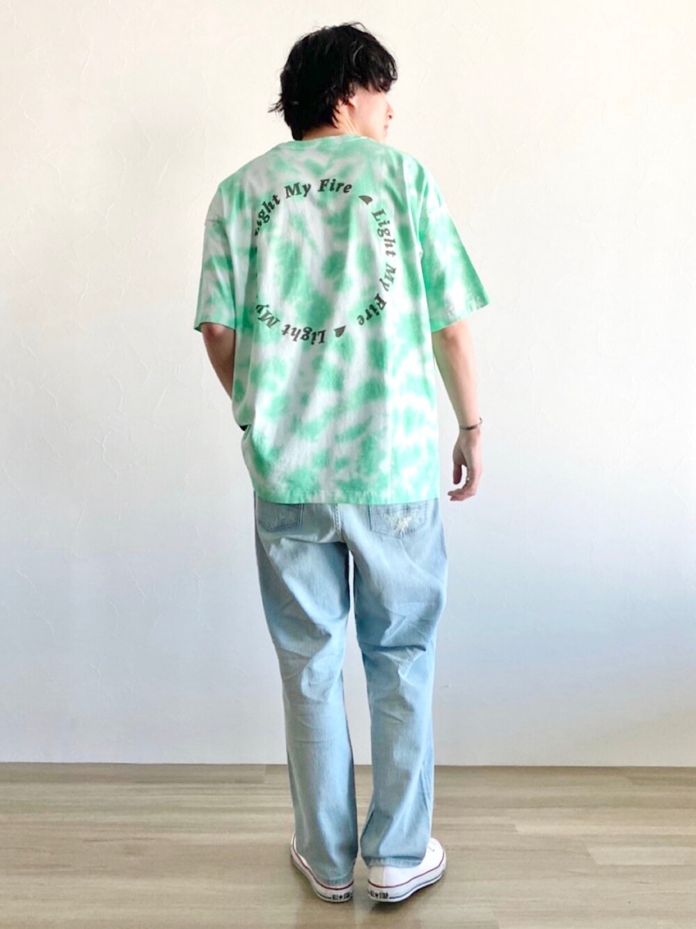 ビッグシルエットのタイダイTシャツにワイドストレートデニムで合わせた夏のストリートコーデ。