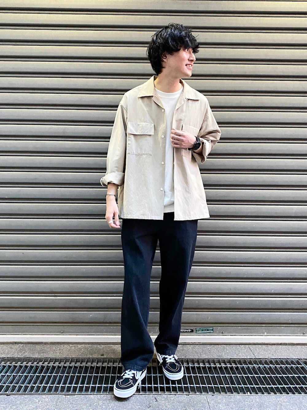 ハリ感のあるビッグシルエット開襟シャツにワイドデニムを合わせました。