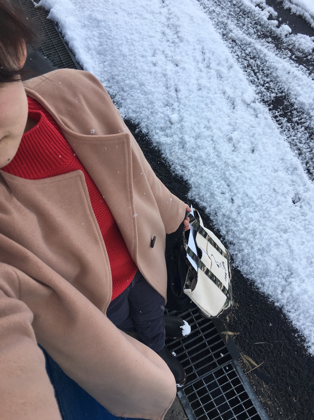 ついに雪降っちゃいました☃️笑 めっちゃ寒くてさすがにコートを出しました☺︎ 地味コーデには珍しく赤ニットメインで❤️笑