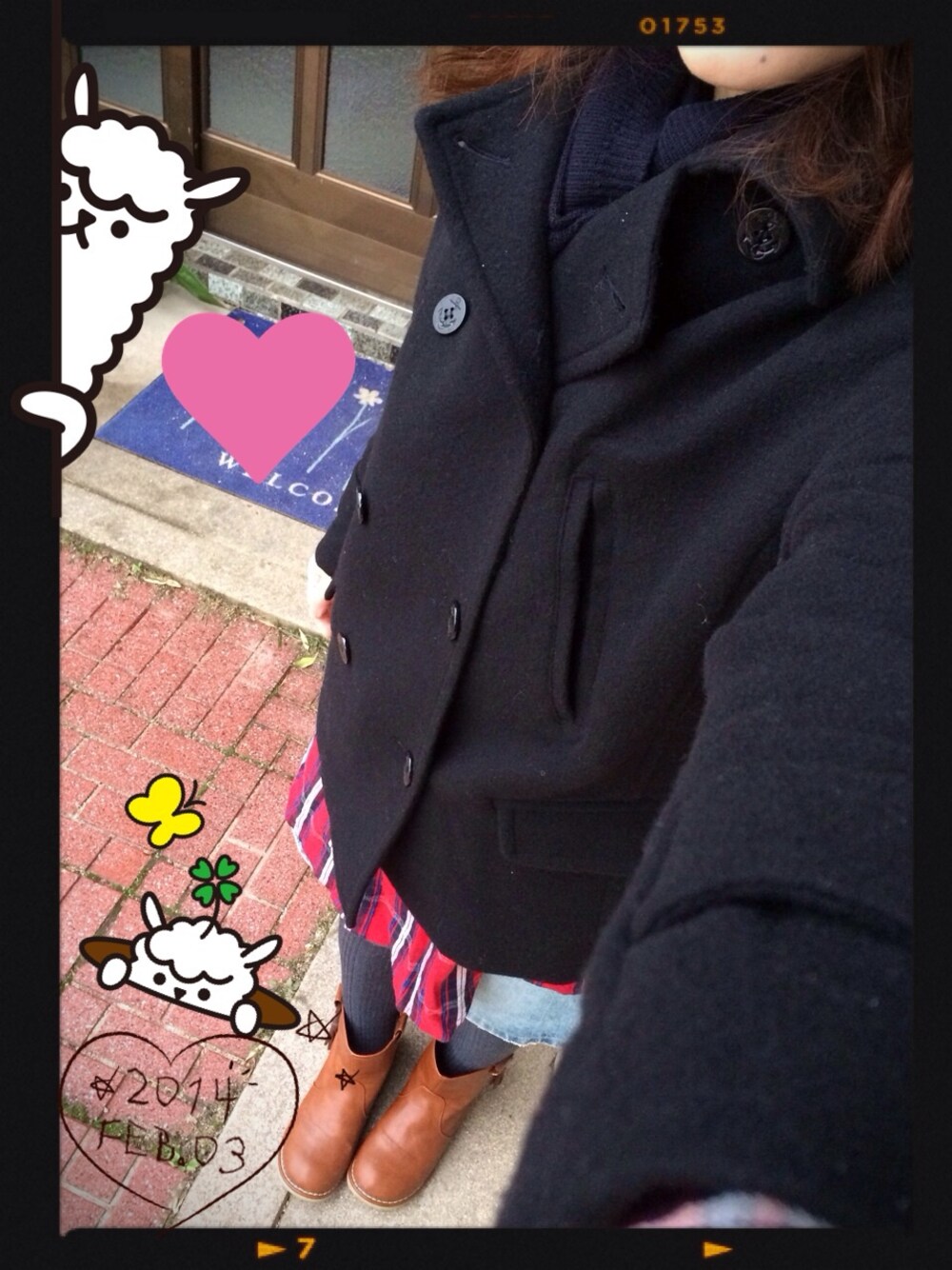 SALEで購入したジャーナルスタンダードのPコートを主役に。チェックシャツで差し色コーデ。スッキリ見えるようにしました☻