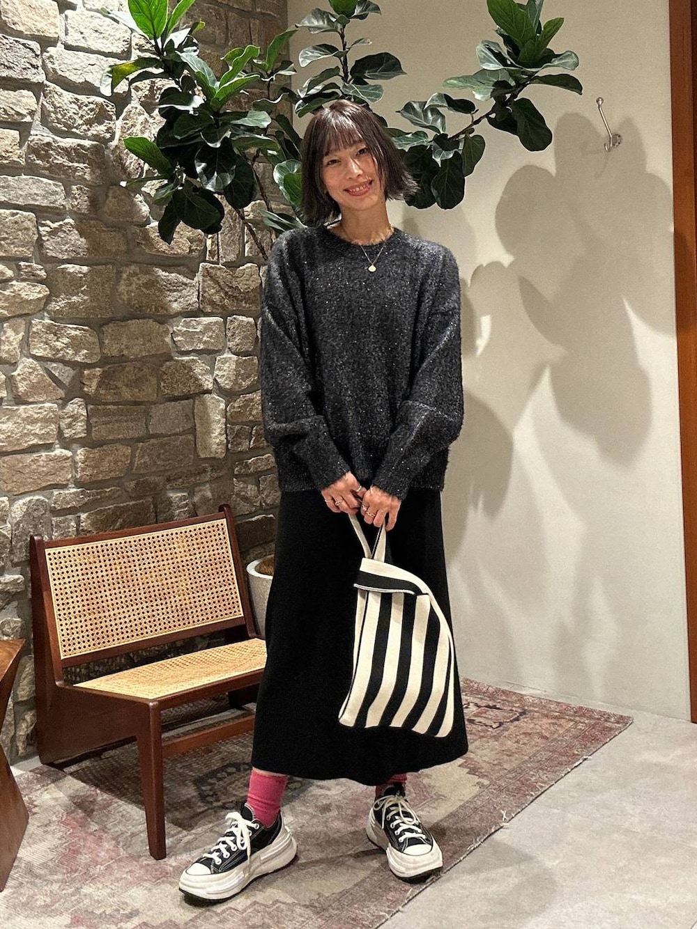ラメニット最高👍 ストライプニットトートも 軽く持てて、可愛い♡ スカートは人気のカーゴの裏起毛♡
